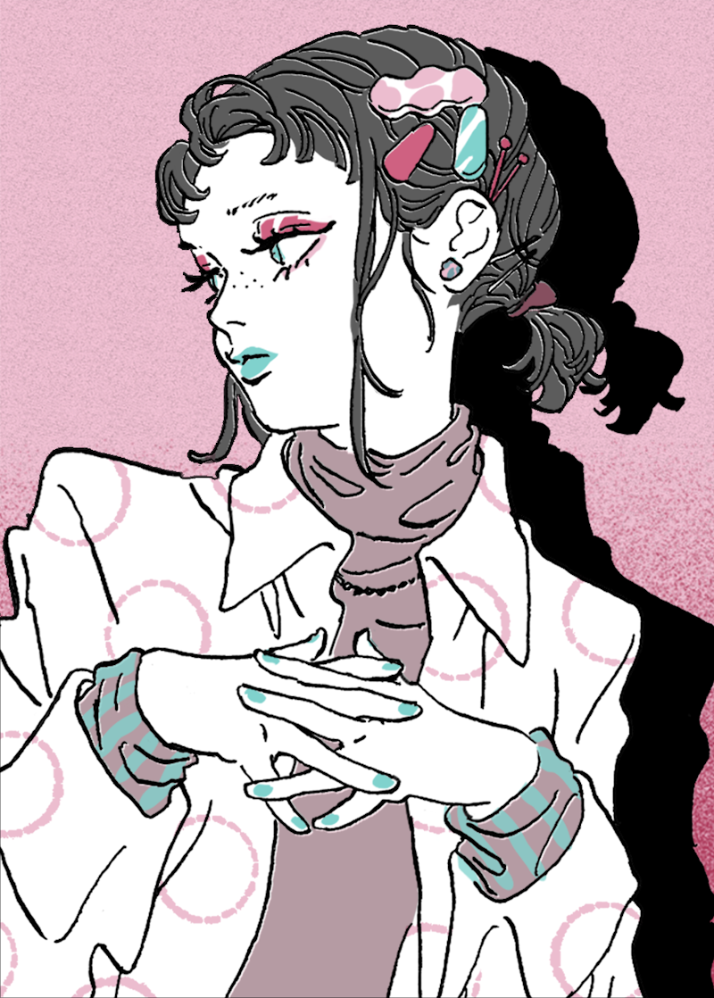 主流はハチ周りをタイトにまとめるスタイルだけれど、そこに個性を感じるニュアンスをプラス。全体に「まとめ髪アレンジウォーター」を吹きかけたら、毛束を手櫛でざっくりまとめ、1〜3個ほどランダムにお団子をつくる。お団子の毛先を頭の外側に散らし、「まとめ髪スティック」で好きな形にキープしたら完成。前髪を細めのコテでくりくりに巻いたり、ヘアピンやヘアアクセを好きなだけ盛り付けて個性を楽しんで。