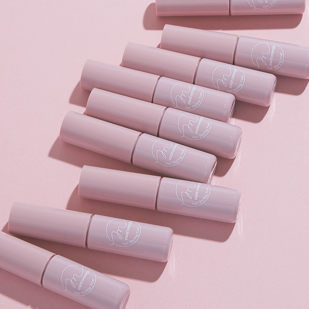 全体に「まとめ髪アレンジウォーター」を吹きかけ、生え際の産毛や耳周りの後れ毛、襟足の毛束をお好みの分量残して毛束をまとめる。まとめた毛束を左右2つに分け、好きな高さでざっくりとお団子にしたら「まとめ髪スティック」でパヤ毛を抑えてセッティング。お団子の毛先を少し出しておくと、動きがあるおしゃれな印象に。残っている後れ毛や生え際の産毛を細めのコテでランダムにくりくり巻いたら、「前髪グルー」で産毛をおでこに貼り付けて、甘くてエッジィな赤ちゃんヘアの出来上がり。